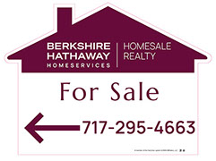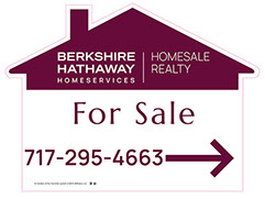 House shaped signs are 23" wide x 17" high. Berkshire Hathaway cabernet & white printed identically on both sides according to Berkshire Hathaway Homesale guidelines with your office phone number and stock Homesale.com website. Available on 4mm corrugated plastic material only